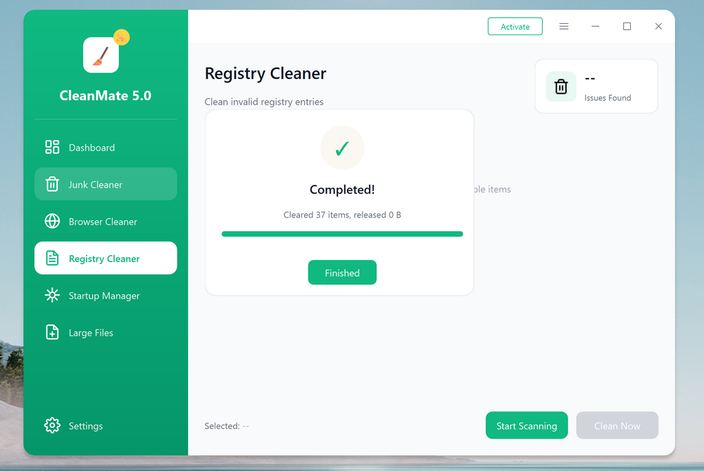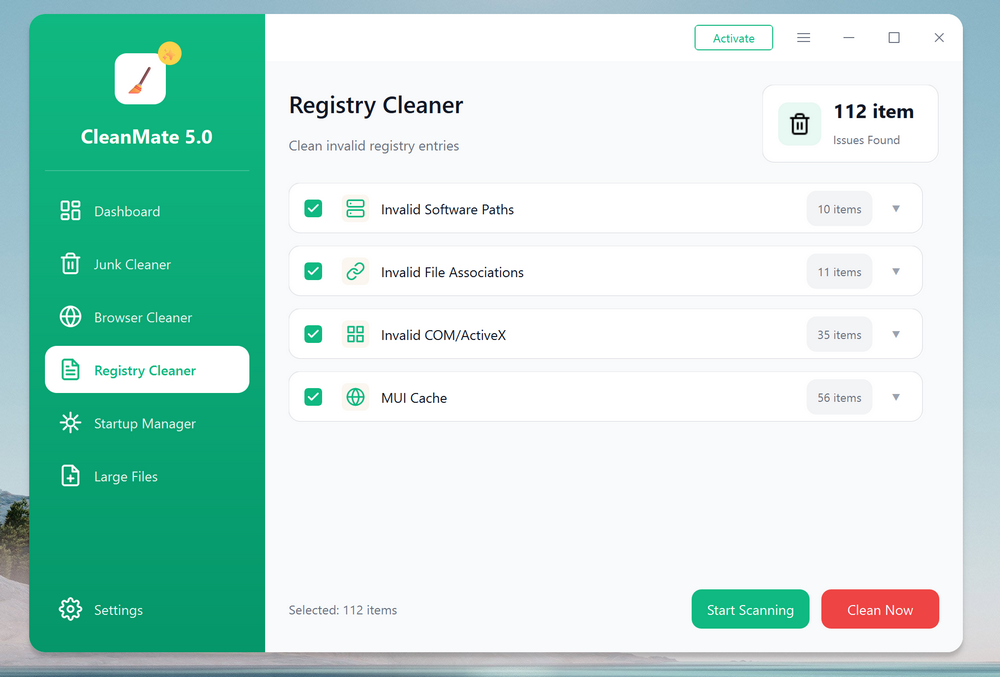 Over time, the Windows registry can become cluttered with invalid, outdated, or broken entries left behind by uninstalled programs, system updates, and driver changes. While these issues are usually invisible, they can sometimes lead to system errors, slower performance, or software conflicts. Using a trusted tool like CleanMate provides a safe and controlled way to clean up the registry on Windows 11 and Windows 10.